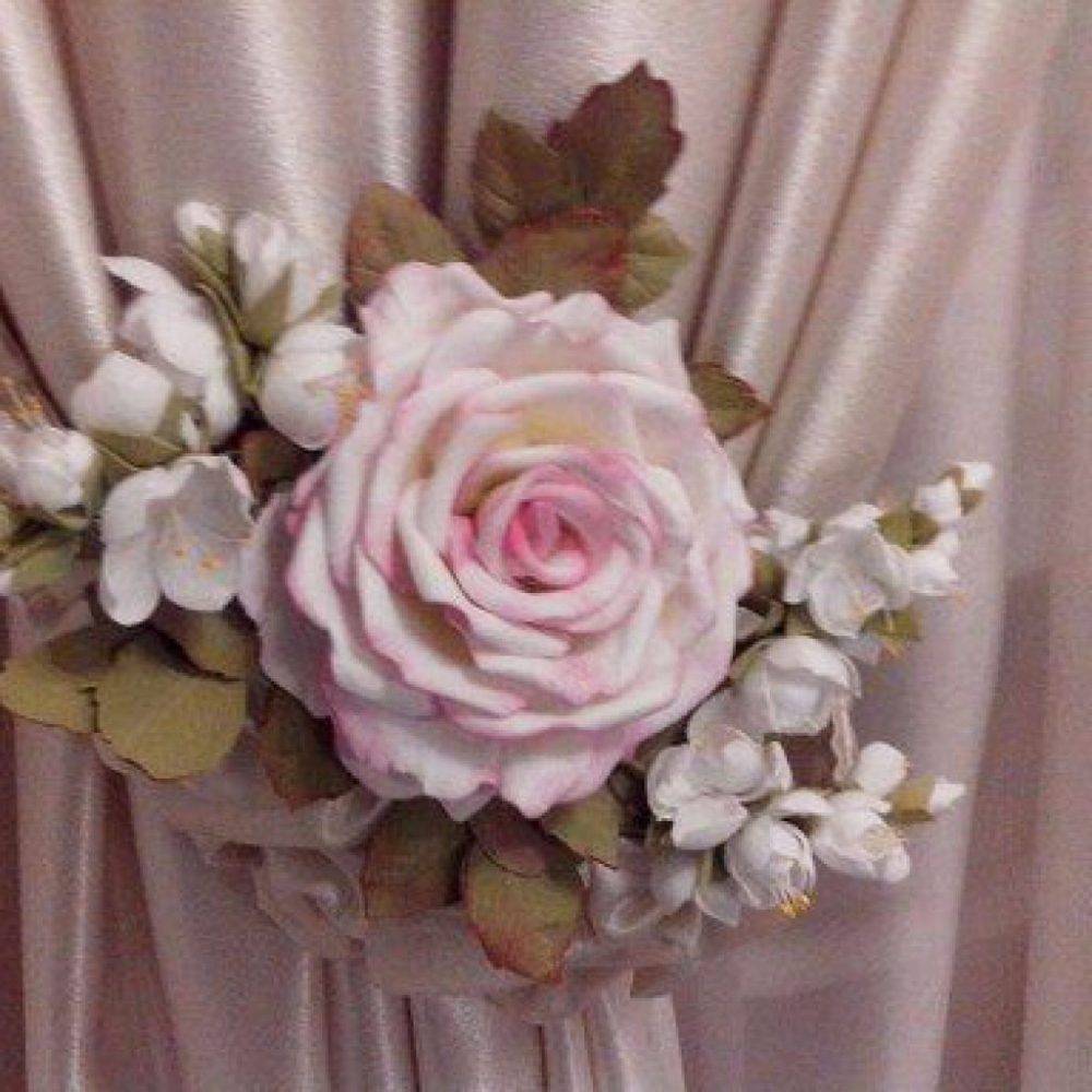 - Подхват из цветов. В магазине покупают любой прихват, к которому пришивают цветы. Их берут в магазинах для декора или ручной работы. Но самостоятельно их тоже делают. Эти зажимы придают помещению изысканность, утонченность и грациозность.