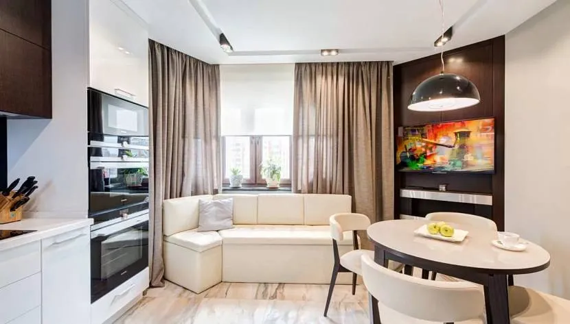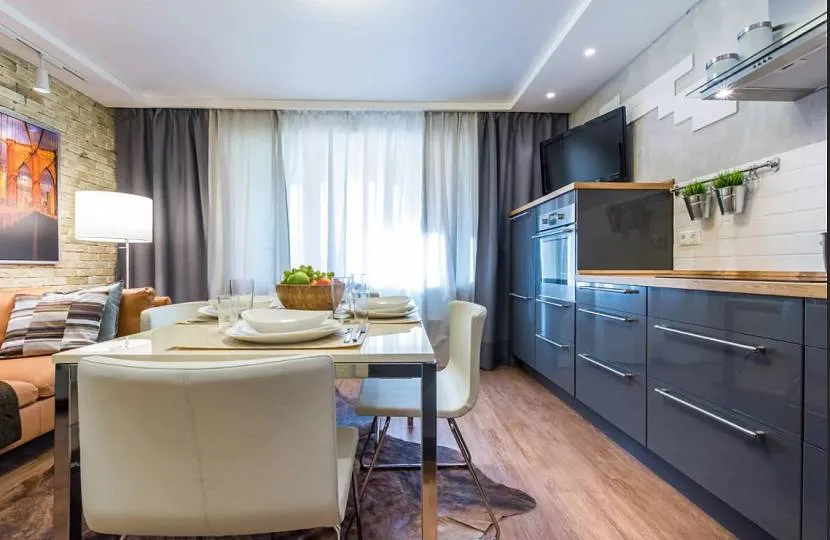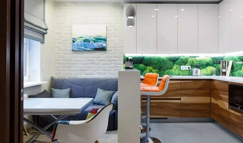Для лаконичного пространства выбирают раскладную мебель, малозаметные узоры и желательно однотонную отделку. Органично будет смотреться такое оформление с аналогичным диваном — детали интерьера и обстановка в одном цвете всегда кажутся одним целым. В процессе ремонта кухня может стать лишь частью общей обстановки, но все же можно выделить ей отдельный уголок и оформить рабочую зону немного иначе, чем остальную часть комнаты. Другой цвет стен поможет зонировать пространство, возможно, даже «спрятать» один участок от другого. Здесь всегда есть место фантазии и реализации дизайнерских концепций.