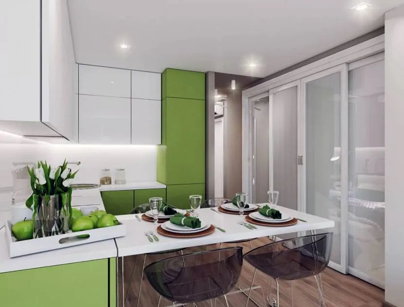 Еще один яркий и жизнеутверждающий оттенок. Он ассоциируется с весной, жизнью и молодостью. Кухня с салатовым гарнитуром получается красочной и сочной, она словно наполняется светом.