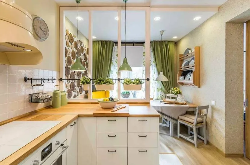 В комнате гармонично смотрятся живые растения на подоконнике. Рабочую стенку можно выложить зеленой плиткой или стеклянной мозаикой.