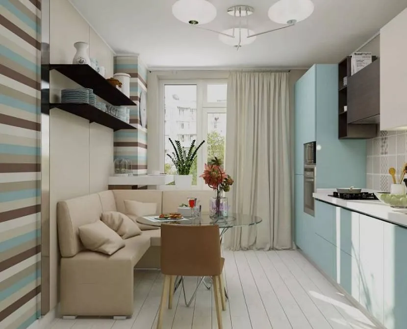 5. Стол (любого типа) и диван. У хозяев кухни с такой площадью появляется возможность оценить все преимущества дивана на кухне. Многие боятся, что он будет «красть» квадратные метры, но на самом деле просто нужно заранее учесть все детали его гармоничного сочетания.