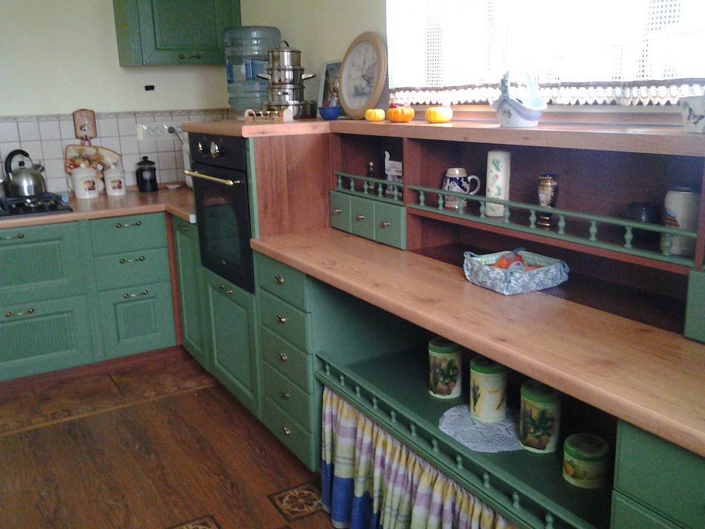 под дерево (для темно-зеленой и изумрудной кухни подойдут темные породы, для салатовой, фисташковой, светло-зеленой – светлый дуб, ясень);