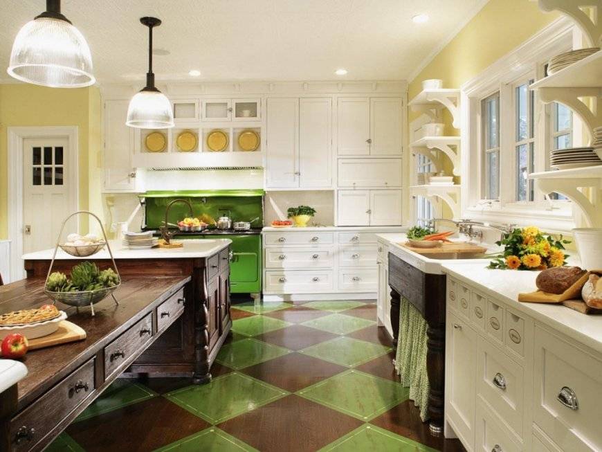Для изысканности кухни напольное покрытие рекомендуется выложить светло-зеленой керамической плиткой. Выигрышным вариантам для оформления пола станет дерево, мрамор и линолеум. Стоит учесть, что при стенах со светлыми тонами пол должен быть немного темнее.
