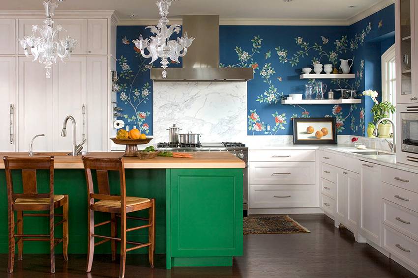 На кухне можно сделать акцентную стену или выделить фартук. Для этой задачи подойдут темные сложные оттенки или яркие – изумрудный, бирюзовый, малахитовый и т.п.
