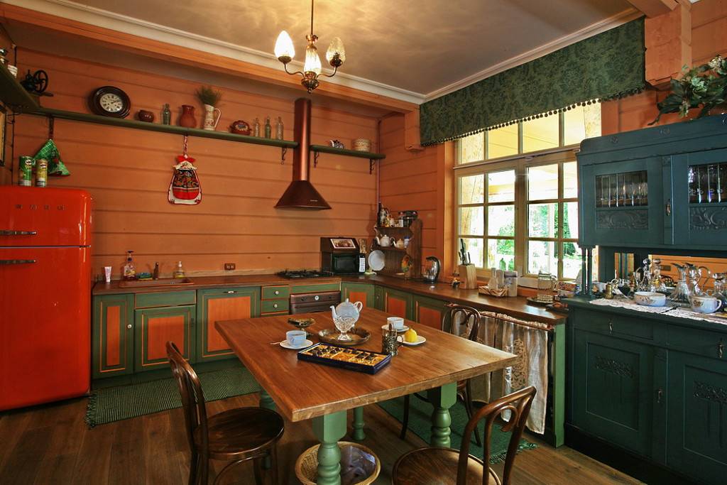 Дизайн содержит в себе черты деревенского дома или ранчо с предметами и отделкой из натуральных материалов. Кухня с добротной деревянной мебелью является визитной карточкой загородного стиля. Стены цвета травы и текстиль такого же окраса станут прекрасным фоном для гарнитура из массива. Самыми распространенными оттенками в деревенском стиле являются оливковый, мятный, иногда встречается изумрудный. Дополнением к ним служат серые или бежевые тона той же насыщенности, что и основной цвет. Помещение, оформленное в зеленой гамме, украсят плетеные кресла, глиняные горшки и вазы, текстиль из грубоватых неокрашенных нитей.