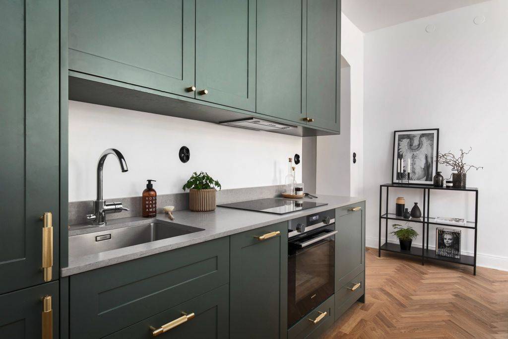 Этот тон хорошо сочетается с золотом, что можно выгодно обыграть с помощью техники, элементов декора и отделки. Единственный нюанс – обилие изумрудного не подойдет для очень маленькой кухни. Этому цвету нужен простор, чтобы не выглядеть «тяжелым» и мрачным.