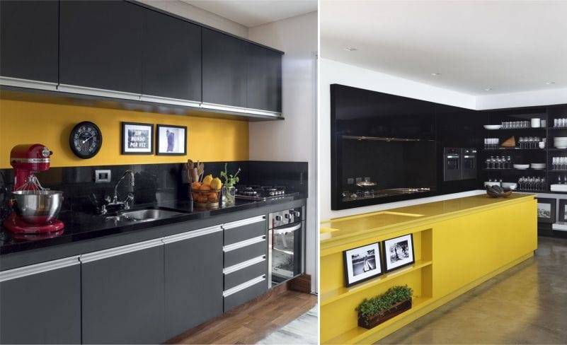Глянцевые фасады уместны для современных стилей интерьера — минимализма, хай-тека, фьюжна и пр. Если вы выбрали классику, прованс или кантри, стоит приобретать гарнитур с матовыми поверхностями. При желании также можно комбинировать разные фактуры как, например, на следующих фото кухни жёлтого цвета.