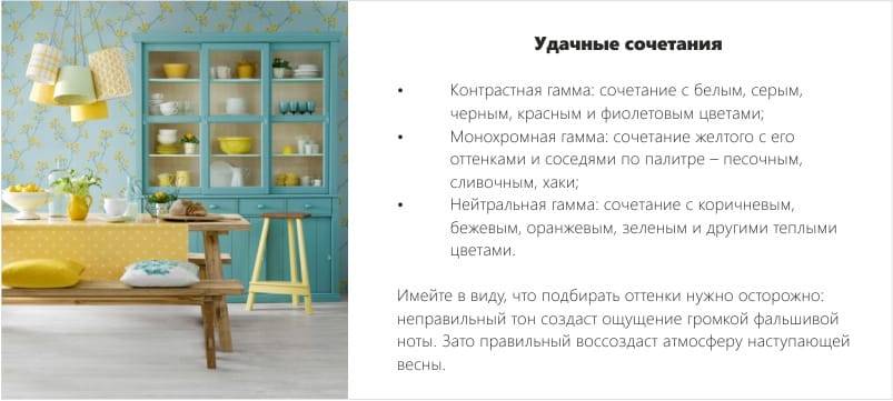 - Теплые желтые тона хорошо сочетаются с теплыми оранжевыми, красными, коричневыми цветами. А холодные оттенки (например, лимонный) сочетаются с холодными колерами – голубым, сиреневым, серым, серебристым.