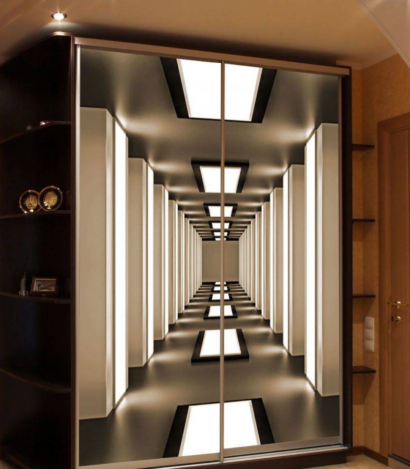 Если у вас имеется ниша, вы можете сэкономить на стенках шкафа, так как вместо них будут стены. Нужно лишь заказать двери купе, системы для обуви и других вещей, установить их в прихожую и пользоваться. Если шкаф должен выполнять еще и декоративную функцию, существуют разные техники – декоративная пленка или пескоструйный рисунок.
