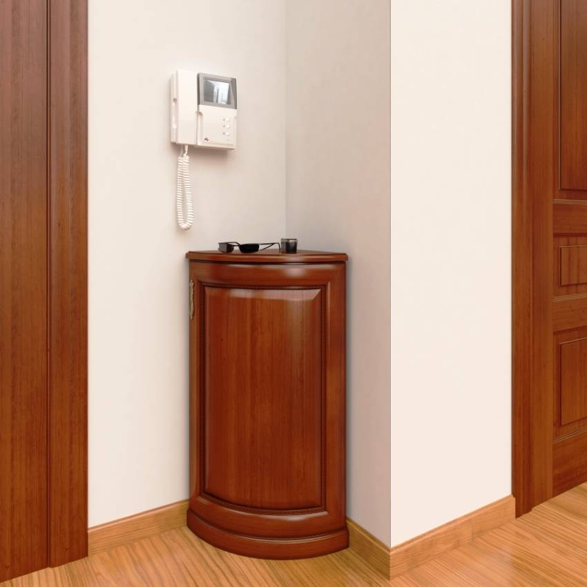 Если прихожая достаточно просторная, то подойдет мебель без боковых стенок, которая будет соприкасаться со стенами. Для малогабаритных прихожих можно подобрать не треугольный, а пятиугольный шкаф.