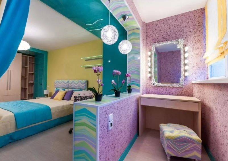 - Цветовое разнообразие. Изготовители жидких обоев предлагают покупателям широкую палитру оттенков. В каталогах представлены как спокойные пастельные или офисные тона, так и яркие неоновые цвета.