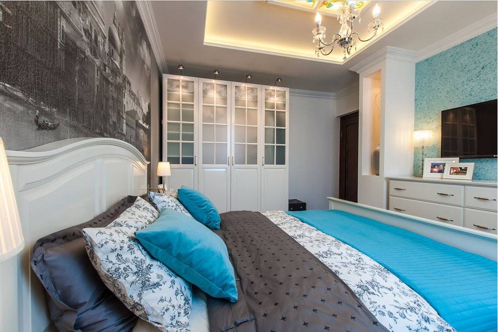 - Если кровать расположена в нише, её выделяют жидкими обоями другого оттенка или красивыми рулонными обоями.